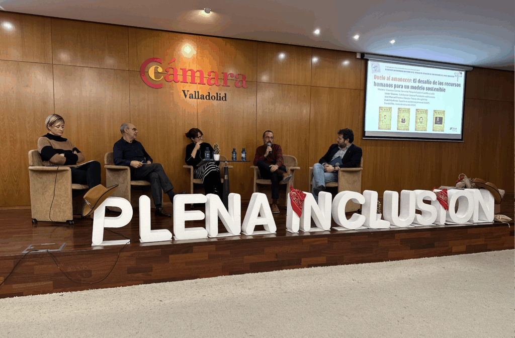 Como cierre a la jornada, el debate “El desafío de los recursos humanos para un modelo sostenible”, con Javier Güemes, vicepresidente de EASPD; José Manuel Fresno, director Fresno, the right link; Iñaki Martínez, experto en asistencia personal (ASAP) y Eva del Río, junta directiva de AEDIS como “tertulianos” y moderado por Vanessa García, gerente de Plena inclusión Castilla y León, se debatieron grandes líneas de actuación. A lo largo de esta hora de debate se puso el foco en la dignificación del trabajo de los cuidados (tanto de los asistentes personales como de otras figuras de atención directa), en la necesidad de una formación pero con diferentes enfoques por parte de los ponentes, el salario como una cuestión importante para la retención del talento unido a una buena política de personas y, finalmente, la necesidad de abordar el problema de la falta de profesionales en el sector de forma global, ya que es el sector que más crecerá en los próximos años en todo el mundo y en comunidades como Castilla y León más aún.