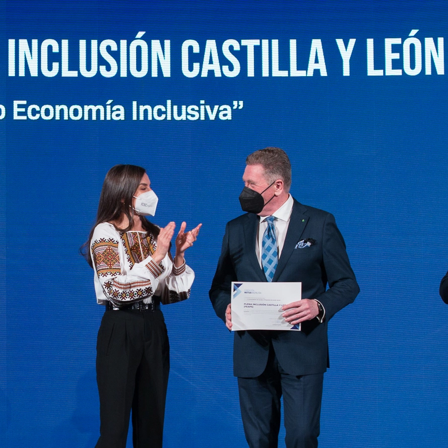 La Fundación Mutua Madrileña ha entregado esta mañana en Madrid su X Convocatoria Anual de Ayudas a Proyectos de Acción Social a 36 proyectos de entidades sin ánimo de lucro, que ha presidido S.M. la Reina Doña Letizia, acompañada de la ministra de Justicia, Pilar Llop, y del presidente del Grupo Mutua y su fundación, Ignacio Garralda. Juan Pablo Torres, presidente de Plena inclusión Castilla y León, ha asistido al acto al ser la Federación una de las entidades seleccionadas. El proyecto seleccionado es “Economía inclusiva” y se caracteriza por ser un proyecto innovador que profundiza en la formación y docencia de la economía para personas con discapacidad intelectual. “Es todo un reto acercar una ciencia, a priori compleja como es la Economía, a la personas con discapacidad intelectual a través de unos materiales didácticos y pedagógicos para que en las aulas se pueda enseñar Economía de verdad: macro y micro economía, tributos, finanzas…” destacas Jesús Martínez-Sagarra, del área de empleo de Plena inclusión Castilla y León.