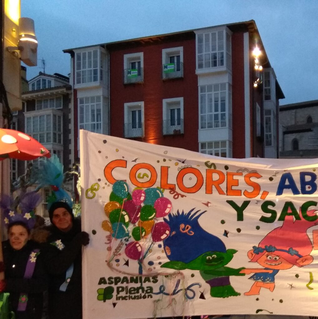 La comparsa de Aspanias,«Colores, abrazos y sacude tu pelazo», abrió el desfile de carnaval de Burgos, que recorrió el centro histórico de la ciudad. 94 personas disfrazadas de trolls de siete colores diferentes formaban un «arcoíris humano» que llenó las calles de alegría.